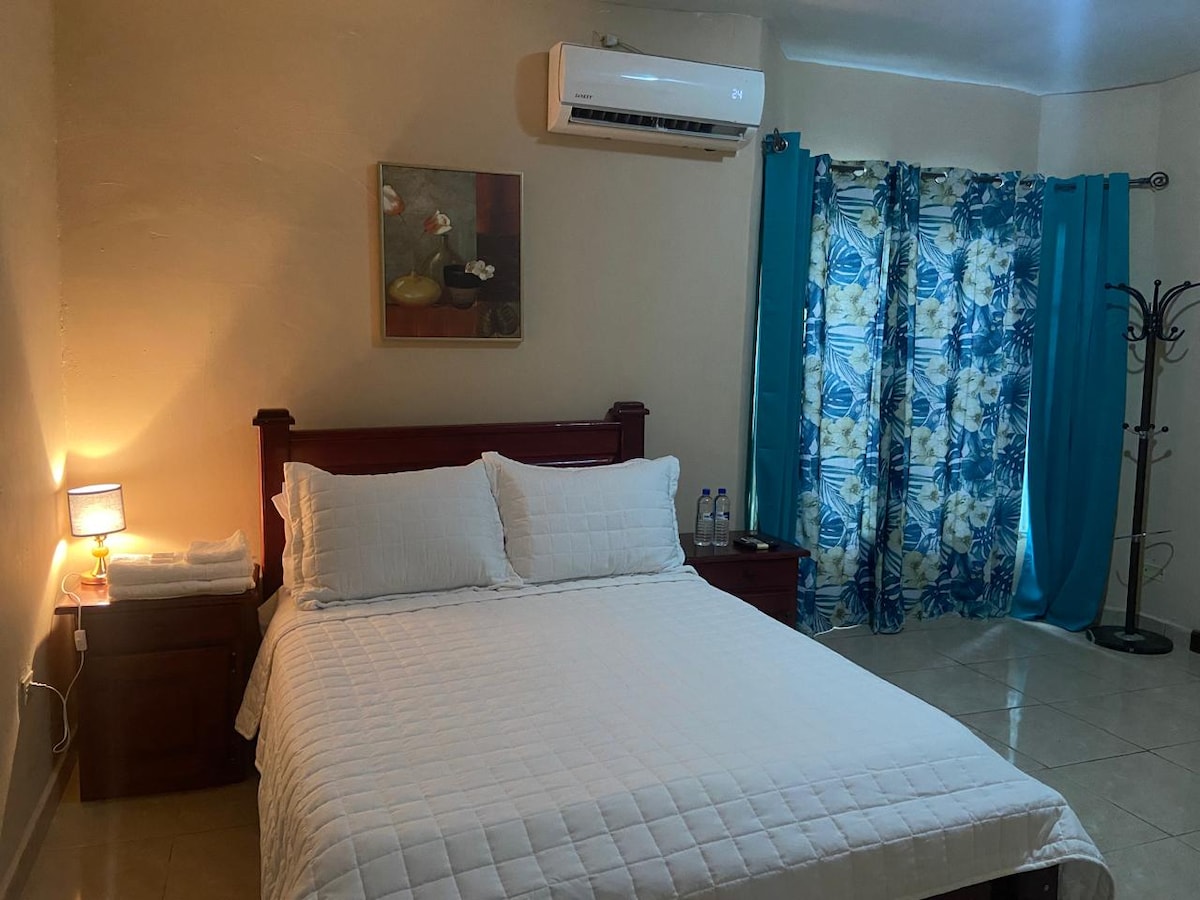 Disfruta de la sencillez de este alojamiento tranquilo y céntrico para 4 huespedes en el área de David. El alojamiento cuenta con dos récamaras (1 con cama queen y otra con cama full), un amplio baño con agua caliente, cocina bien equipada, sala con televisión por cable, netflix y amazon prime, comedor, lavandería completa, aire acondicionado en sala y ambos cuartos. Cercano a gimnasio, supermercado, restaurantes y a sólo 5 minutos del centro de David.