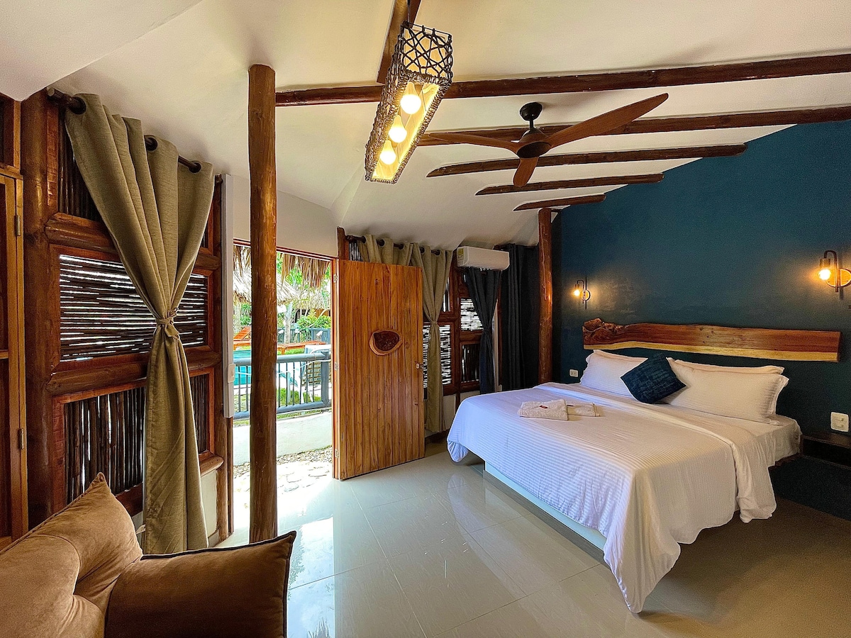 Cabaña Lavanda – Tu refugio tropical Es la cabaña más amplia y cómoda de Villa Yue. La cabaña cuenta con cocina privada, comedor y sala de estar, ofreciendo todas las comodidades del hogar. La habitación incluye una cama king size y un sofá cama, además de un colchón extra disponible. Desde el balcón podrás relajarte con un café o disfrutar de la vista hacia la piscina. La piscina se comparte con otras 3 cabañas de la villa. Perfecta para parejas, familias o grupos pequeños.