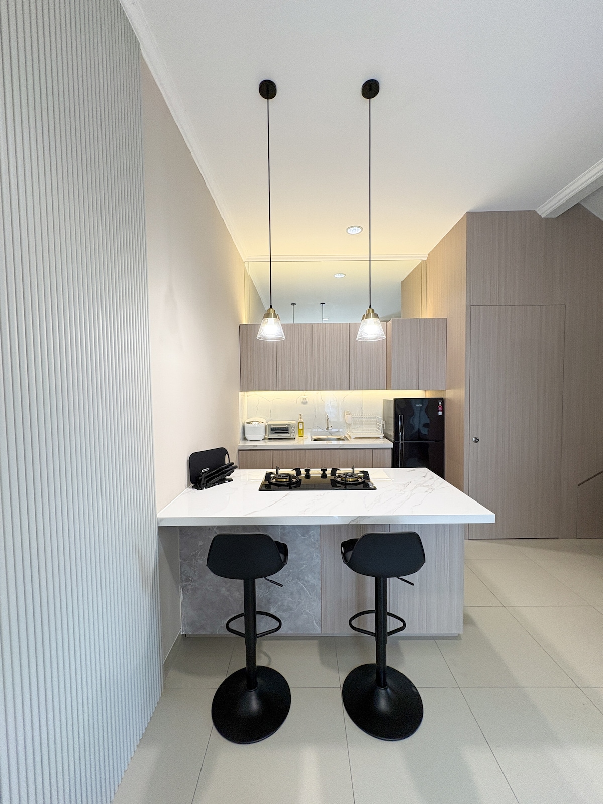 Welcome to Sunset Residence @Branz managed by "ComfortLux" Enjoy breathtaking sunset views from this Luxurious and spacious home. Located in the heart of BSD City, this property offers easy access to nearby Mall, F&B, Concert and Exhibition Centre (ICE). With Luxury Italian Prada Marble Wall, CaesarStone NightSky Bar Table, Cozy SofaBed is perfect for couple as well as groups of 4 seeking luxury vacation. Free parking, WiFi and Smart Home. Experience luxury and comfort Sunset Residence @Branz.