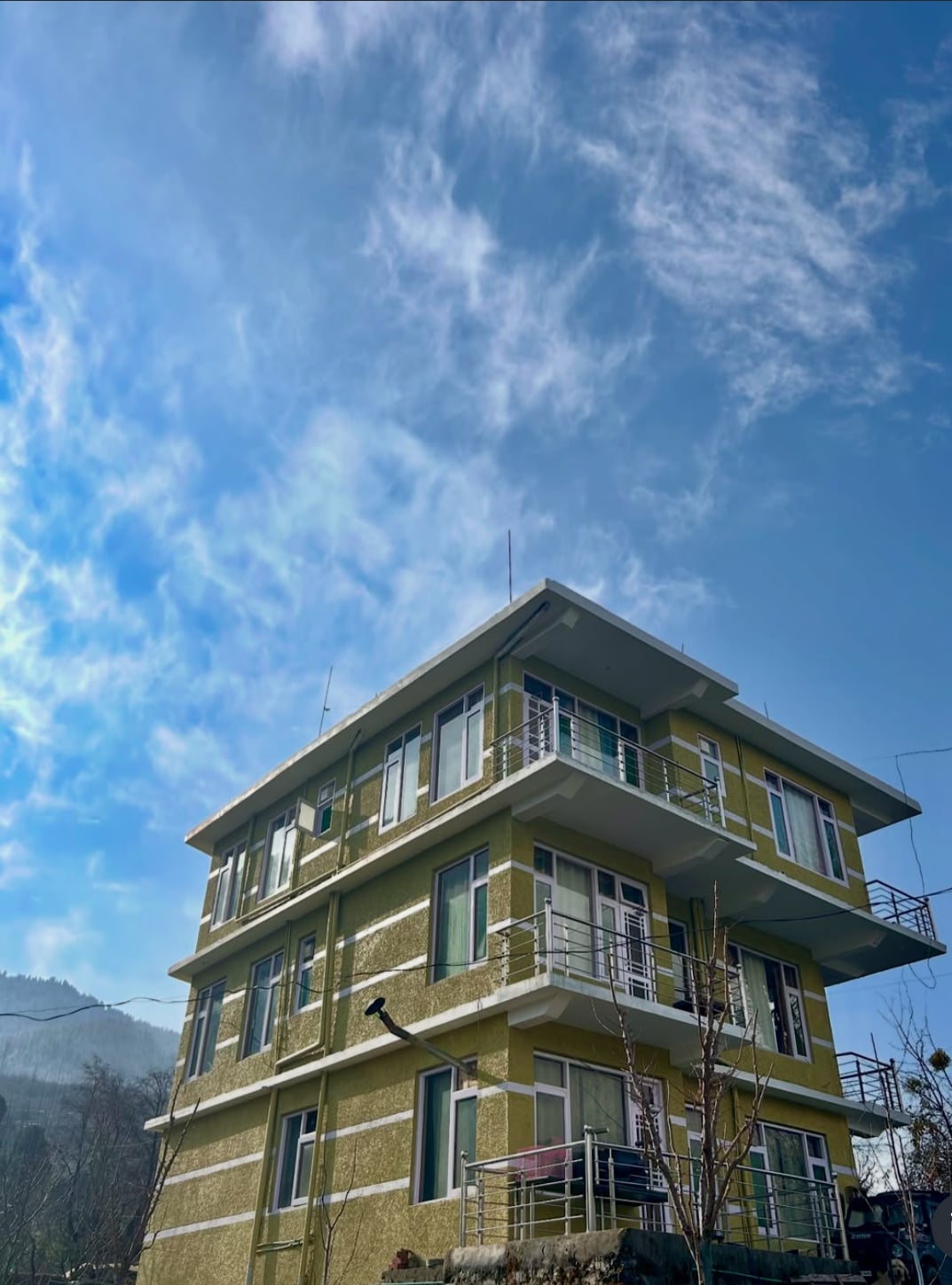 A newly built dedicated double deluxe room standing on the top of the mountain in Manali. It is a private place where only 2 - 3 houses are nearby this place not more than that. This place is unbelievably charming. From your room, you can see the entire valley and the glacier laden Himalayas of Kullu - Manali valley. This brand new double bedded room has attach kitchenette, hygienic washroom, study table, wi-fi and all basic amenities.