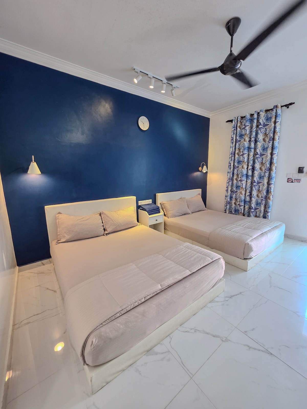 INSTALACIONES - 3 dormitorios. -Dos baños - ! Wi-Fi - Sala de estar - Comedor - Alfombrilla de oración - 1 plancha - Toallas de baño - ! Sofá - Televisor - colchón Dormitorio 1 (principal) Dormitorio 2 y Dormitorio 3 - 1 cama tamaño queen. - Ventilador de techo. - Aire acondicionado - Percha para ropa Baño 1 (inodoro de conexión) Baño 2 - Lavabo - Ducha - Jabón - Champú Cocina. - Armario de cocina. - Refrigerador. - Arrocera - Hervidor eléctrico - Mesa de comedor - Lavadora. Guía de distancia A Chenang 5 minutos Al aeropuerto a 10 minutos. Al embarcadero 31 minutos.