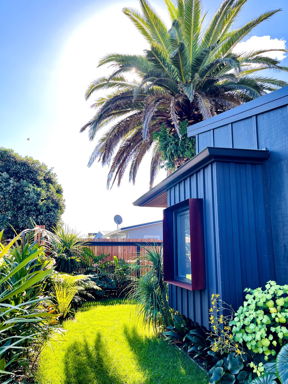 Relájate y desconecta en este alojamiento tranquilo y elegante que está a solo dos minutos a pie de la playa. Única en su clase, esta nueva unidad de lujo de un dormitorio tiene todas las comodidades y servicios de una casa completa, a la vez que es del tamaño perfecto para que una pareja se escape. La casa tiene una cocina completa, sala de estar, dormitorio, baño y zona de lavandería propia. Extremadamente privada, la propiedad tiene su propia terraza/comedor al aire libre, césped con jardines y está totalmente vallada con su propia entrada.
