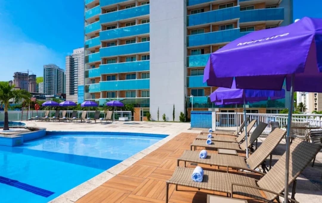 APARTAMENTO COM FAXINA DIÁRIA E ESTACIONAMENTO 24H COM VALET INCLUSO. Acomode-se com conforto e praticidade no Hotel Mercure, Segurança, Ar-condicionado potente, internet rápida, persiana blackout, cozinha equipada, enxoval completo, Smart TV com Netflix conectada. Ideal para lazer ou trabalho, com localização excelente: a poucos passos do shopping, bares, restaurantes e casas noturnas. Com piscina, jacuzzi, academia climatizada, restaurante com bons preços e música ao vivo em alguns dias.