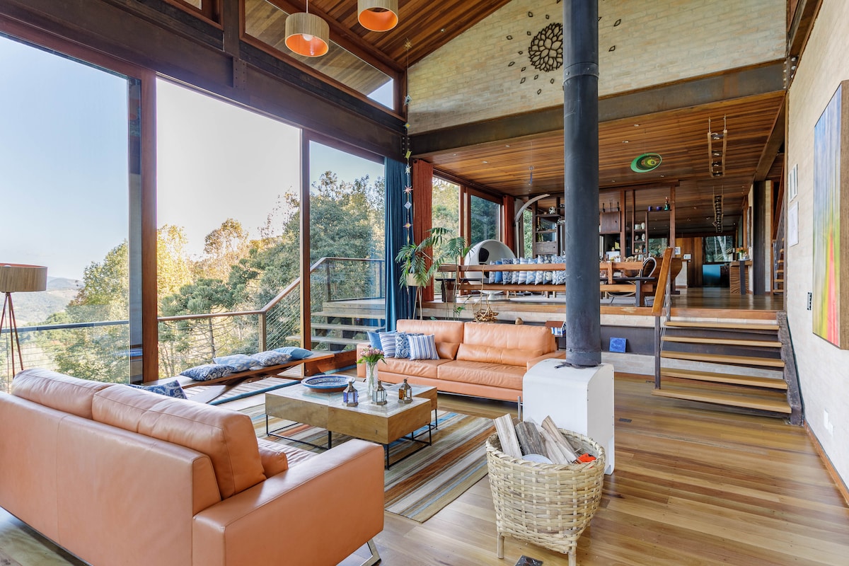 Experimenta lo mejor de Mantiqueira: seguridad, comodidad y naturaleza. Ubicada en el corazón del bosque de Mantiqueira y situada en un condominio privado, nuestra casa de acero corten, con amplias ventanas, se distingue por su arte local y artesanía. Tiene capacidad para 10 personas, que se expande a 24 personas con chalets contiguos. Ofrecemos wifi, agua de manantial, limpieza diaria y un desayuno regional. Perfecto para eventos, reuniones y retiros. Ofrecemos servicios de masajistas, chefs y degustaciones exclusivas