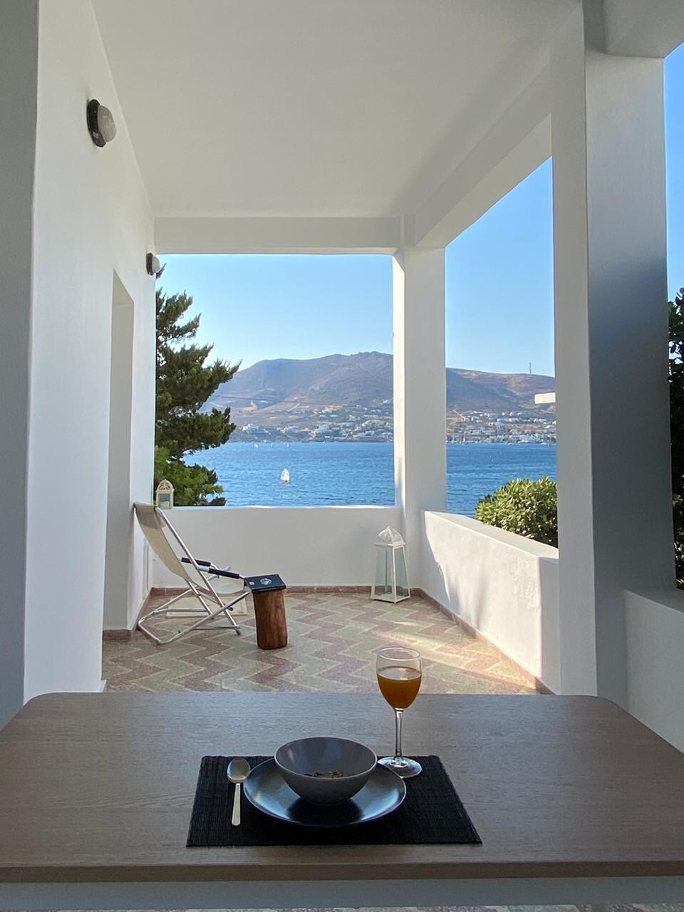 Apartamento de un dormitorio totalmente equipado con vistas frontales al mar. Una cama doble en el dormitorio y 1 sofá cama en el salón, cocina totalmente equipada (horno, nevera-congelador, lavavajillas, 4 fogones), baño con ducha, lavadora, terraza privada con sillas y mesa. Acceso a un patio compartido con acceso directo al mar (rocas) donde los huéspedes pueden darse un baño por la mañana. Vistas frontales al mar desde la sala de estar y el dormitorio. A pocos pasos del centro de Ermoupolis.