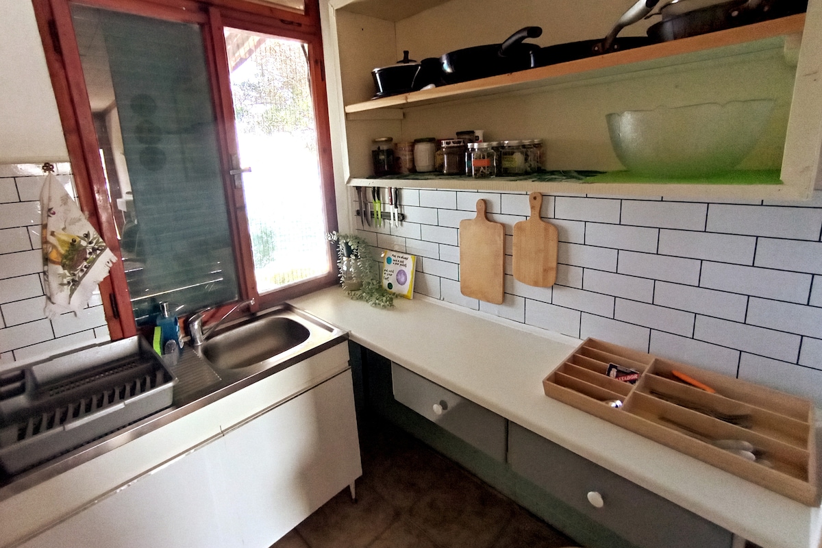 Dainty little house surrounded by old pine trees, shy owls and adorable squirrels in Professors Settlement-Vourvourou. For those who don’t know the area, this is your chance to explore it-local style! Downhill to the closest beach, 3min by car or 10min walk. Uphill on the way up (15 min walking unless you are super fit) through secret paths for the more adventurous. Restaurants, supermarkets, windsurfing, 5min by car or 22min walking. We offer 2 free MTBs during your stay to explore even more ;)
