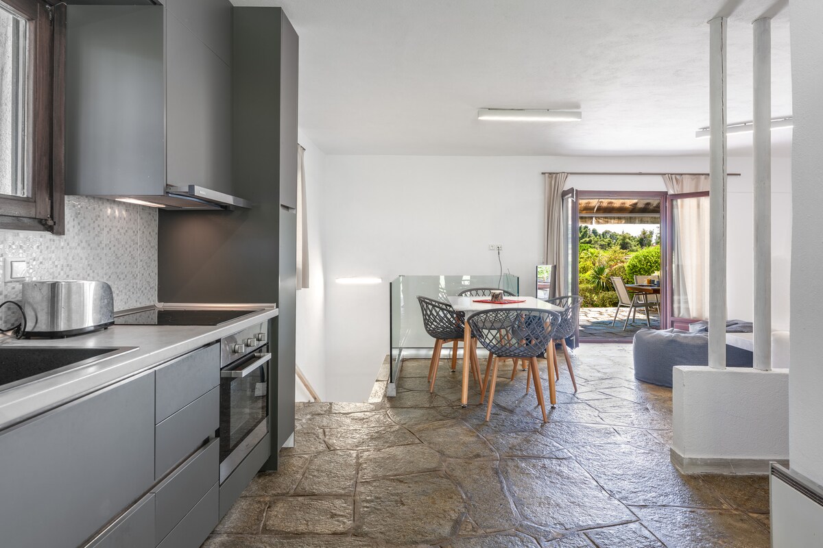 Villa into Sani's pine woods forest. 20' on foot from Koutsoupia beach, Sani beach, Sani Resort and Marina. Garden and balcony in addition to the unique scenery to spend quality time with your loved ones. Private parking spots: 2 The unique position of our villa ensures that you get both the relaxation you seek but also you can have all the amenities that Sani Beach Provide.