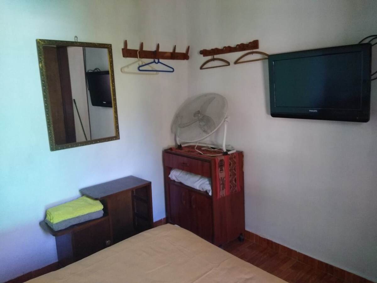 Sumérgete en la serenidad de nuestra encantadora casa de campo, 2 habitaciones (1 con aire acondicionado) y un baño interior. Piscina de fibra de 1,5m de profundidad. Ideal para familias o amigos que buscan disfrutar de la naturaleza. Kiosco en el frente y asistencia cercana, estacionamiento al aire libre. Paz y tranquilidad: no eventos ni música alta. Añadiendo encanto, tres pequeñas mascotas nos acompañan: 1 gato y 2 perros. ¡Tu refugio de fin de semana te espera!