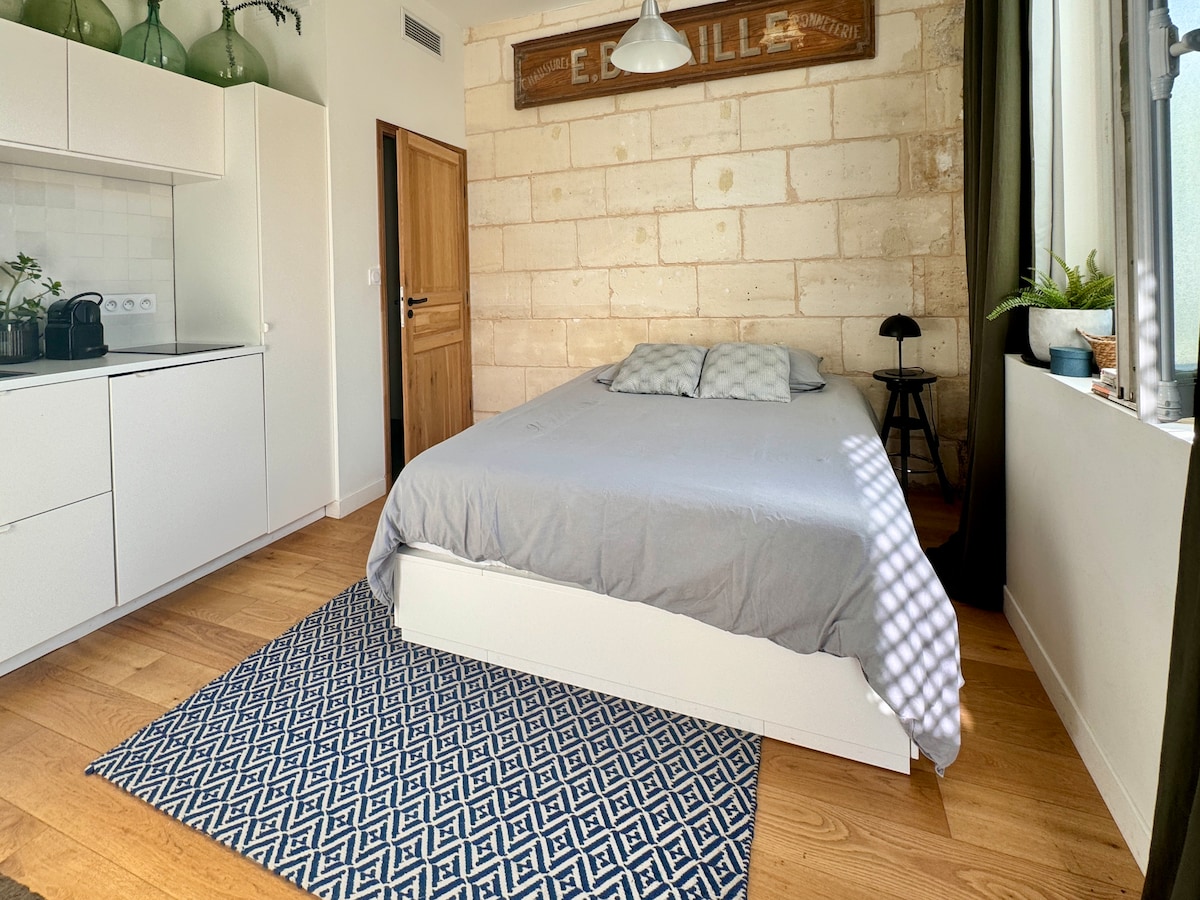 Disfrute de un alojamiento elegante y céntrico en un barrio de tiendas típico de Burdeos. Este apartamento independiente ha sido reformado recientemente por un arquitecto. En un edificio de piedra que ha sabido mantener todo su carácter, combinando todas las comodidades modernas (aire acondicionado, cargador USB, ducha a ras de suelo…) A dos pasos de un supermercado, y cerca del tranvía y autobús que conecta con la estación de tren, el aeropuerto y el centro de la ciudad. Como suplemento, se puede ofrecer nuestra plaza de aparcamiento seguro.