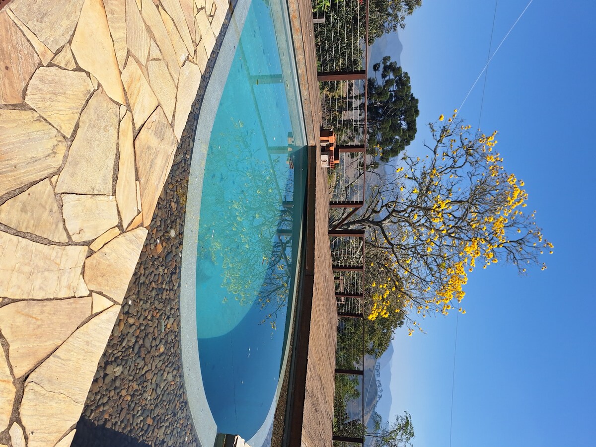 Alugo chalé no Vale das Cruzes com varanda, sala com cozinha compacta,quarto com lareira, ar condicionado quente e frio, banheiro e deck com rede , internet fibra ótica, som ambiente com Bluetooth, 50m². Lindo jardim com fogueira, gazebo e piscina com deck. sem café da manhã.