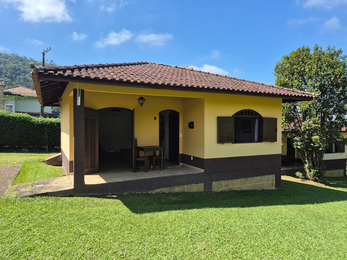 O chalé fica no jardim da minha casa. O rio das Pedras, cristalino, atravessa o jardim com uma sauna á margem. Tem sala, varanda dando para a mata, com rede, cozinha equipada, bom banho quente, e um mezanino - pequeno, não se fica em pé nele, mas bem arejado (duas janelas), com colchão de casal. So é possivel uma pessoa extra (colchonete na sala). Lareira, lenha que for necessaria. Boa Net. O ambiente da mata é úmido, desaconselhável para quem tem alergia. Mercado entrega. Uber nós atende.