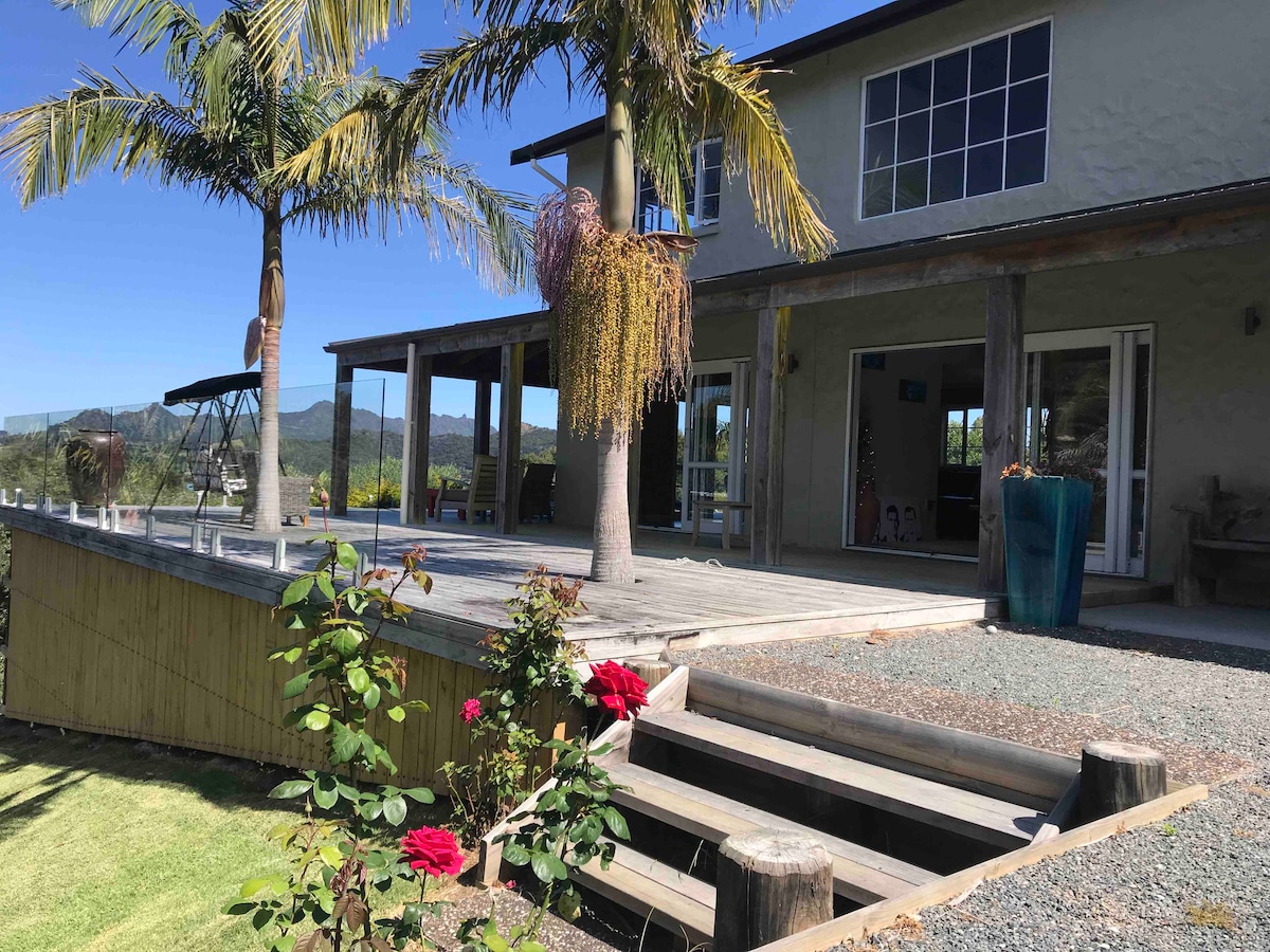 Your tropical hideaway awaits! 🌴 The Banana Hut is a bright, private, romantic retreat in stunning Taurikura Bay with magical views of Mount Manaia. Soak in your own spa pool, rinse off under the warm outdoor shower, or unwind in the sauna. Bikes and kayaks are ready for exploring, and the beach is just a 5 minute stroll away. Surf, hike, fish, or simply relax and let nature restore you in this peaceful coastal paradise surrounded by palms, birdsong, sunshine, or beneath the stars.