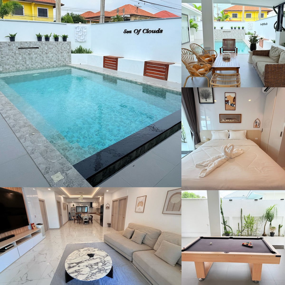 房源概况 这栋独栋泳池别墅位于芭提雅中天区域,设有5卧6卫,每间卧室均配备独立卫生间,智能马桶,保障客人私密性。别墅全新装修,空间宽敞明亮,配有独立庭院与私人泳池,可舒适容纳 10-12人,非常适合家庭、朋友聚会或团体度假。 地理位置 别墅距离中天海滩仅100米,步行即可到达。小区周边 300 米内拥有餐厅、咖啡店、药店和便利店,生活便利。驾车可快速抵达主要景点: • 3分钟:中天夜市 • 10分钟:Central 百货、唐人街、Terminal 21、79 成人秀 • 10分钟:步行街、格兰岛码头、美人鱼网红餐厅 无论是海滩、购物还是夜生活,都能轻松安排。 房屋亮点 • 5间卧室均为独立套房,配有智能窗帘 • 6个卫生间,多人入住也不拥挤 • 私人泳池与花园,定期维护 • 超大客厅和餐厅,适合聚餐和休闲 • 全屋空调、高速 Wi-Fi • 社区安静、安全,适合家庭入住 管家服务 提供 24小时管家服务,协助入住指引、路线导航 可选增值服务 提供曼谷/芭提雅接送机、包车服务、租车、包船出海、景点及秀场门票预订、私厨上门、上门烧烤、翻译等服务,让假期更加便利和轻松。