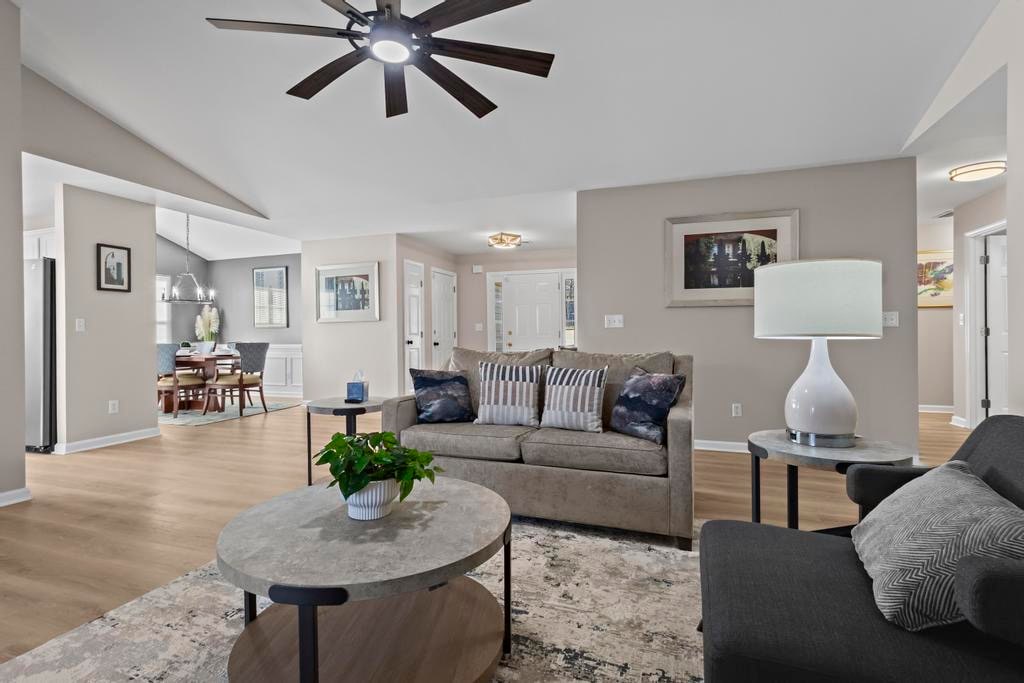¡Relájate en este encantador y elegante espacio! Nuestra casa de 3 dormitorios ofrece mucho espacio con tres dormitorios y tres baños completos. Te va a encantar la acogedora habitación con un cómodo sofá y una silla blancos, que también sirve como un futón con capacidad para 2 personas. Además, tenemos un colchón inflable tamaño queen disponible para dos huéspedes adicionales. Con espacio para un máximo de 10 personas, ¡esta encantadora casa es perfecta para tu escapada con familiares y amigos!