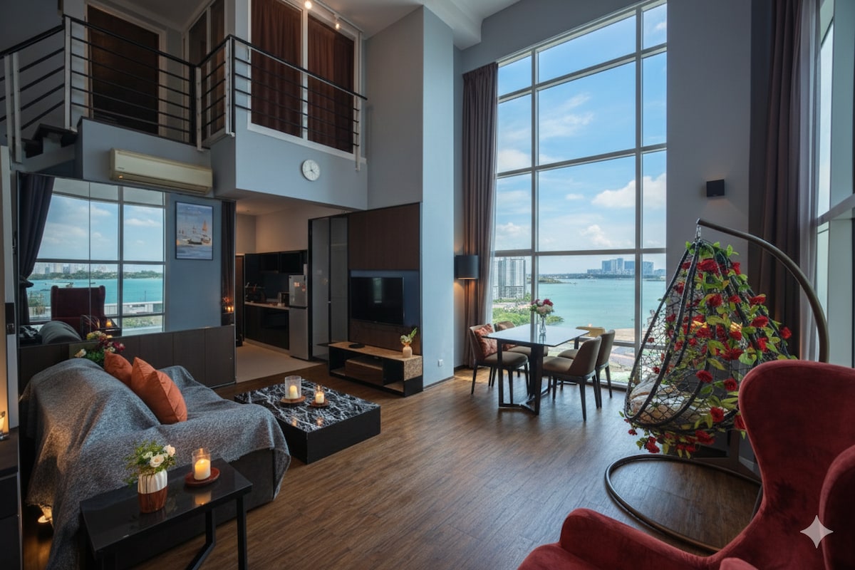 Disfruta de una suite dúplex con vista al mar en el último piso en Maritime Suites, Georgetown, ideal para familias, parejas o estancias cortas. Despiértate con hermosas vistas al mar con fácil acceso a los sitios históricos, cafés y centros comerciales de Penang. Este luminoso dúplex con vista al mar ofrece una cómoda sala de estar, acogedoras habitaciones y cocina totalmente equipada. Los huéspedes disfrutan de acceso a una piscina, gimnasio y seguridad las 24 horas, cerca de Gurney Drive y atracciones clave, perfectas para una estancia relajante junto al mar en Penang.