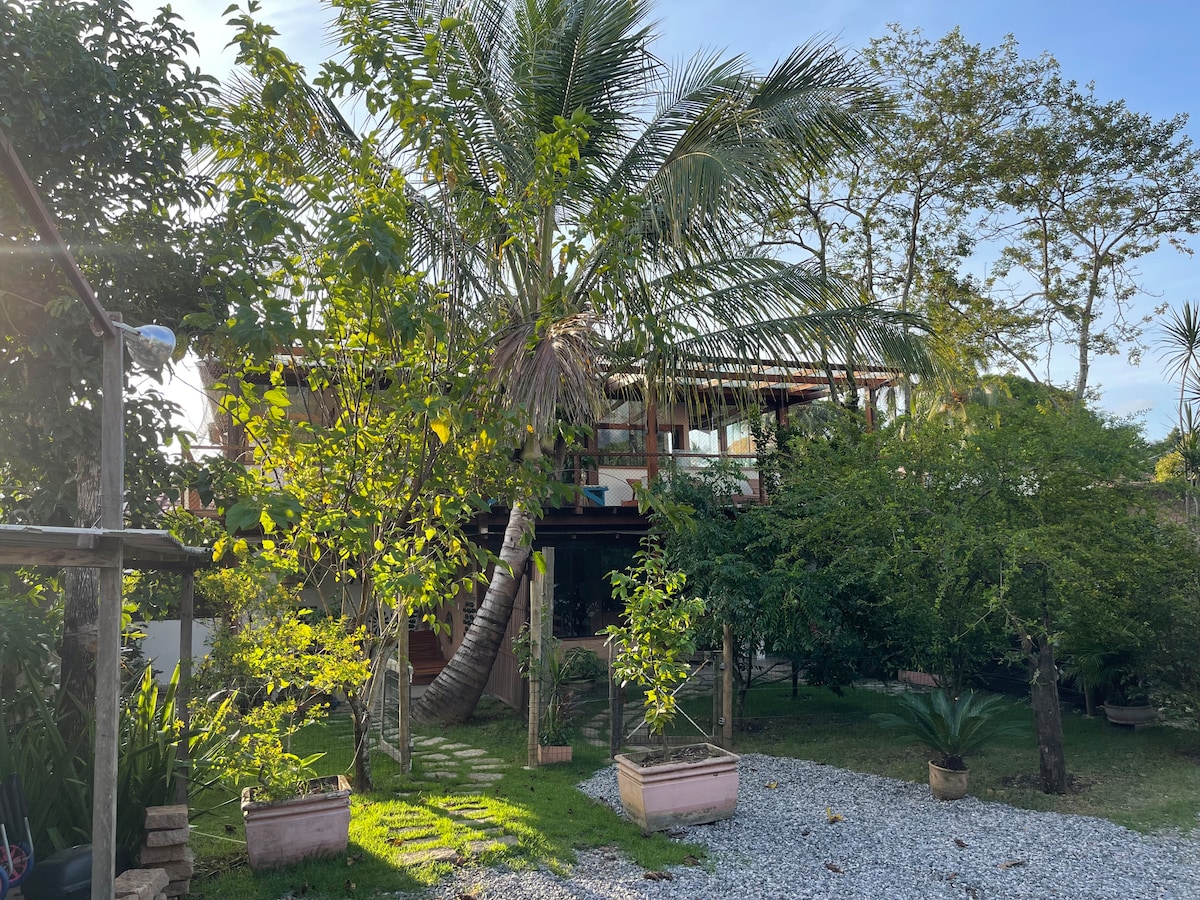 Un bungalow construido artísticamente en cada detalle... bañera abierta al bosque con techo de cristal dan la sensación de estar inmerso en la naturaleza, con una higuera centenaria al frente y muchas aves... íntimo y acogedor en conexión con la Naturaleza en contacto con esta zona de reserva de la Mata Atlántica. La otra ducha de hidromasaje está en la terraza abierta al bosque y es deliciosa de día o de noche con cielo estrellado y luna.