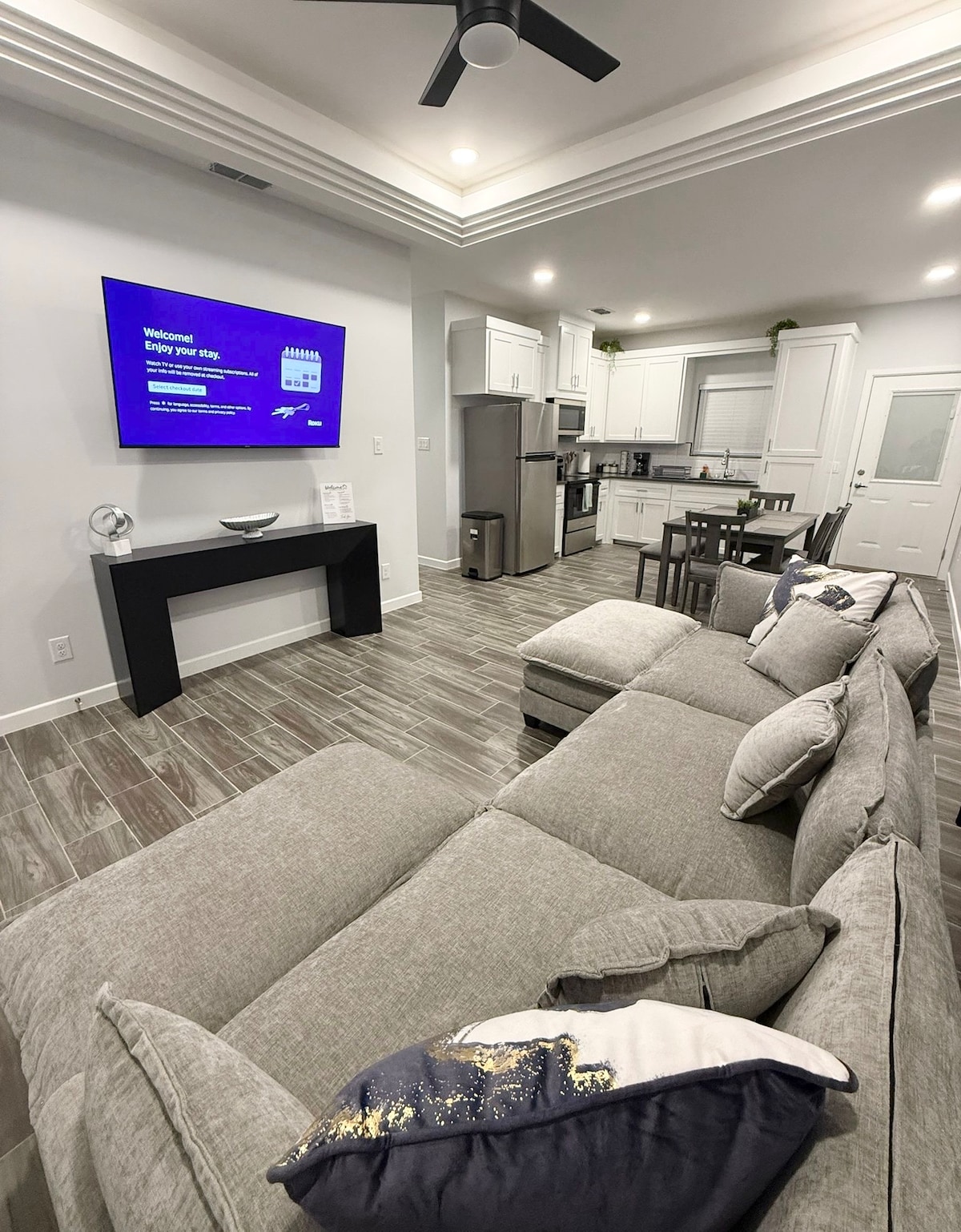 Simple entrance to the spacious living room where the Natuzzi leather sectional sofa awaits you for either pleasure or business. You will have a 55 inch Sony Smart TV to see your favorite movies or perhaps watch the latest on Youtube. Relax or fall asleep in this comfortable sectional sofa with your family. Comfort in your home away from home. Our sofa is designed to provide the best comfort for our guests. We value our customers and strive to make sure our guests are satisfied and happy.