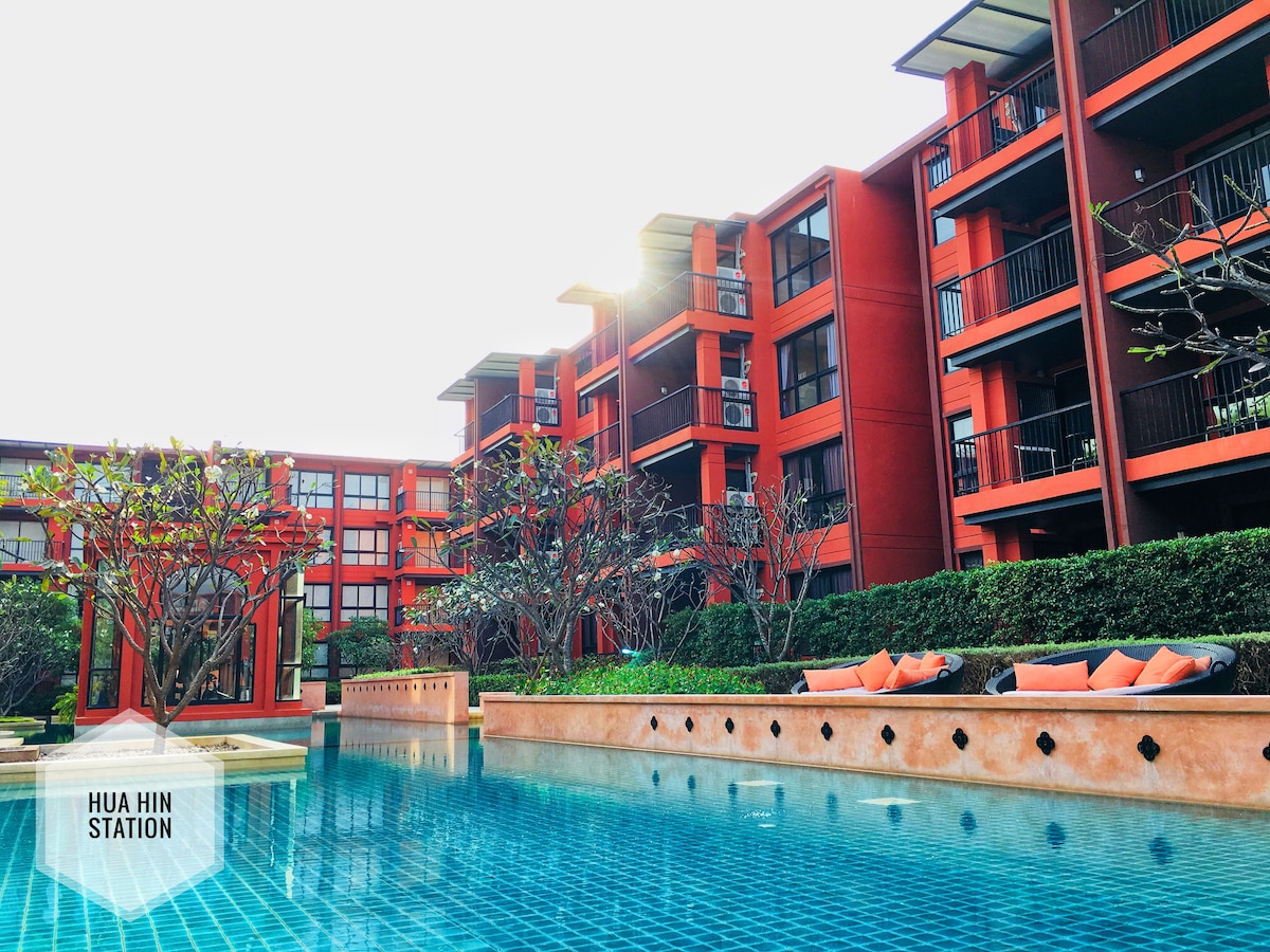 *LOW RISE, not affected by earthquake • Luxury & very comfy sleep with Omazz mattress • Quiet & private • Free 1 car parking • Beautiful pool & Gym • Near Beach & Night market Resort Condo, BEST LOCATION IN THE HEART OF HUAHIN!! Next level of urban living awaits, luxurious modern coastal condo .You have access to city-center amenities, such as the restaurants, shopping malls and a sandy tropical beach. Large & specious place can fit up to 2 prs(35 sqm)