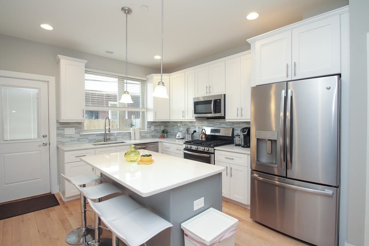 ¡Te encantará esta hermosa casa adosada moderna y de moda! Perfección renovada con un espacioso espacio de 2000 pies cuadrados con 4 pisos que constan de 4 dormitorios (5 camas) y 2,5 baños. ¡Tiene capacidad para 10 personas y cada dormitorio tiene vestidor! Maravillosos espacios al aire libre con una terraza de dos niveles junto a la cocina y enormes terrazas en la azotea con muchos asientos. Increíble ubicación céntrica a poca distancia en coche de todas las atracciones que ofrece Filadelfia. ¡Perfecta para socios de viajes de negocios, escapadas familiares y grupos pequeños!