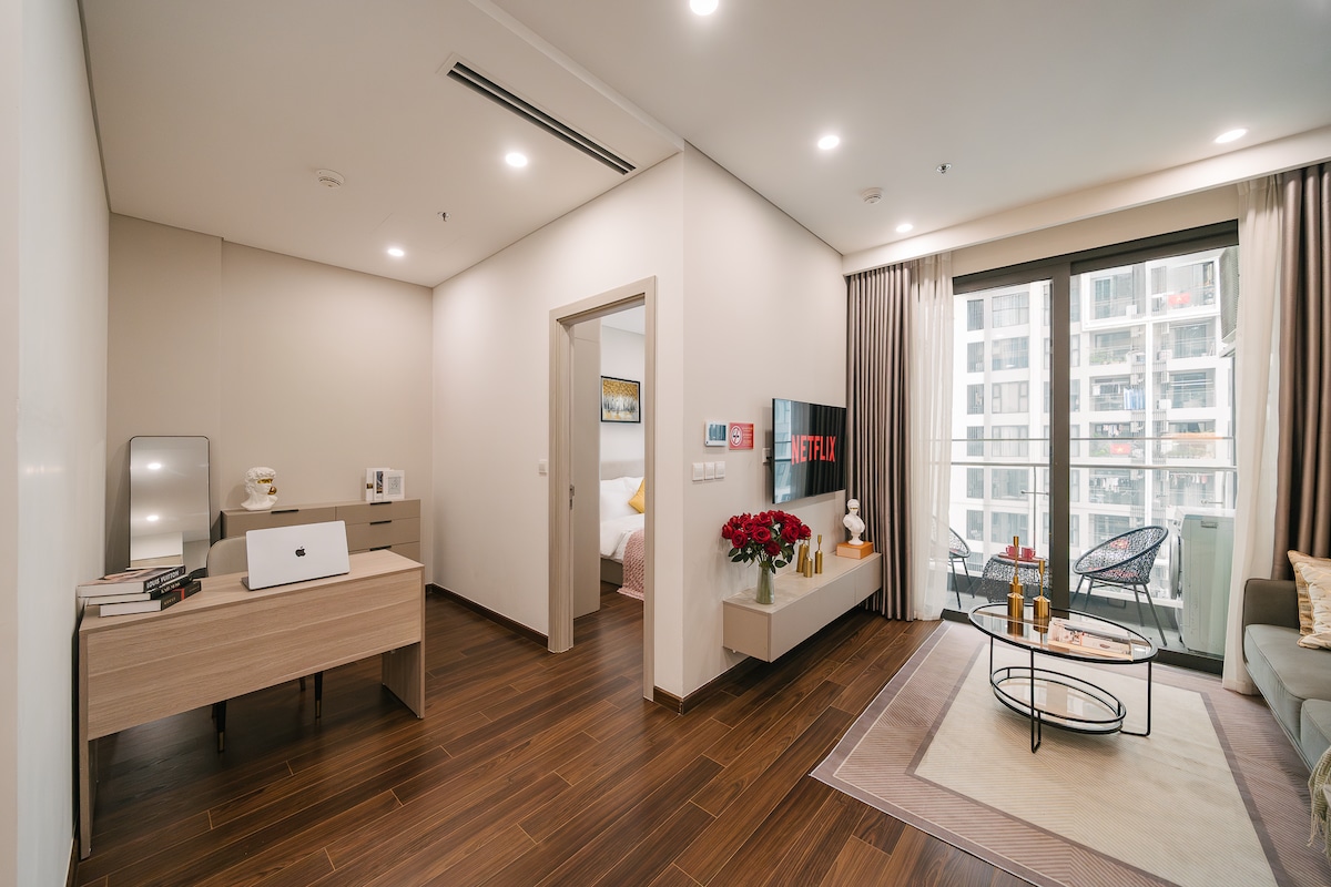 Stay 3 Nights free 1 way Airport. Contact us directly for transport arrangements. Serene, light-filled space with panoramic city views. Captures sweeping city skyline views that inspire focus and reflection—perfect for the ambitious professional seeking a stylish, uncluttered haven amid the urban pulse. This thoughtfully designed two-bedroom retreat feels like a private sanctuary, blending modern Hanoi energy with timeless calm. Your elevated base for meaningful work and quiet recharge.