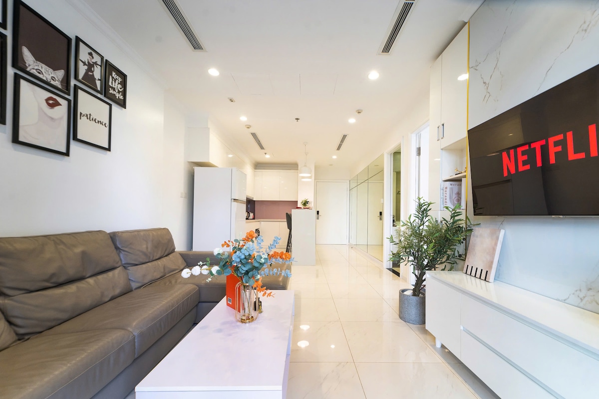 Acogedor apartamento de lujo en el sexto piso situado en una ubicación privilegiada a solo 10 minutos en coche del centro de la ciudad. Amplio apartamento de 64 metros cuadrados con todas las comodidades y espacio para hacerte sentir como en casa. Puedes tumbarte en una suave cama tamaño king para una buena noche de sueño, cocinar en la cocina, tumbarse en el sofá viendo el edificio Landmark 81 brillar por la noche o tomar una taza de café caliente en el balcón viendo el amanecer. Una lujosa piscina en la azotea, 2 mini supermercados: 7 once y Winmart. Propietario amable y servicial.