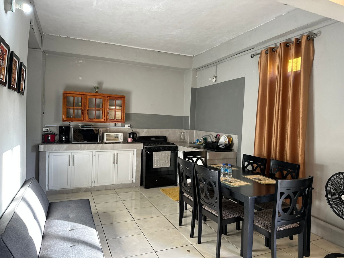 The Apartment is about a 6 minute drive to the Airport The unit includes - Electric kettle Toaster Pots and Pans,Dishes and Utensils Sandwich maker 1 queen size bed Sofabed 1 bathroom Walk-in Closet Parking for one vehicle AC Electronic gate Security Cameras Wifi H/C water TV Stove Fridge Microwave Washer and dryer Situated in a quiet neighborhood,close to supermarkets, gas station, pharmacy, fast food outlets,restaurants, schools, pubs, malls, bird sanctuary, etc. *No smoking