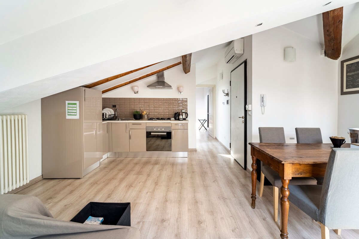 First floor apartment with separate entrance on 2 levels, renovated with very fine finishes, parquet on the floors, visible beams and new furniture. It’s equipped with all comforts and it’s very close to the central Piazza Maggiore. Downstairs there’s one living room with a fully equipped kitchen, one comfortable sofa bed and one TV, upstairs one comfortable bedroom, one bathroom with window and one big comfortable shower. Sheets, towels are provided. WIFI connection available. air conditioned