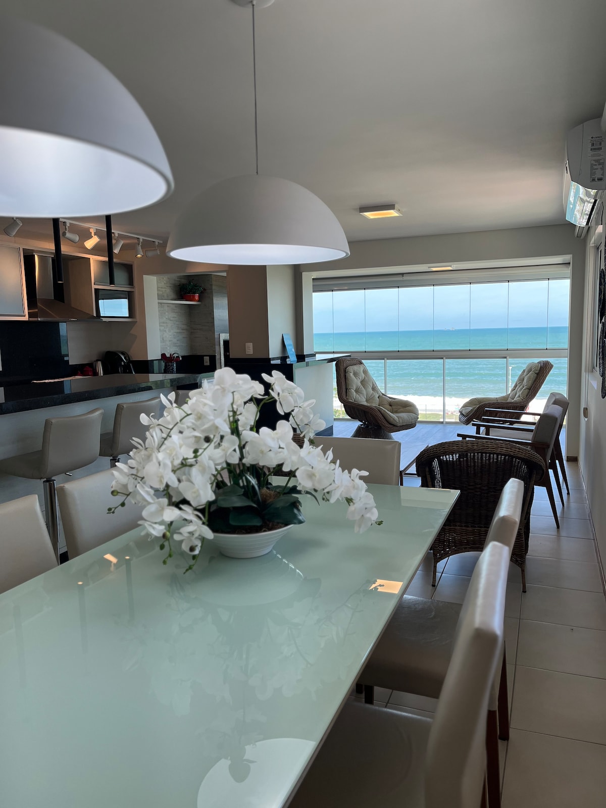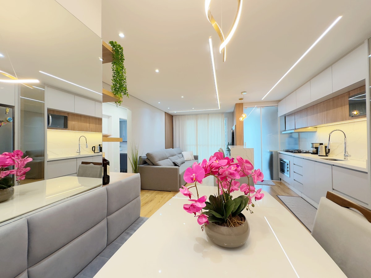 Hermoso apartamento a pie de playa con acceso exclusivo a la playa. Ofrece comodidad para hasta 5 personas, totalmente equipado con un estilo moderno y único. Gran ambiente familiar con muchas opciones de ocio: Piscina infinita y jacuzzi Piscina infantil Bar húmedo Piscina termal Solarium Sala de juegos Sauna Estudio de Fitness y Pilates Pistas deportivas Cine Espacio Kids y Playground Espacio Gourmet y Salón de Fiestas Espacio Pet Estacionamiento Acceso al Parque Beto Carrero en 15 min. Se admiten mascotas