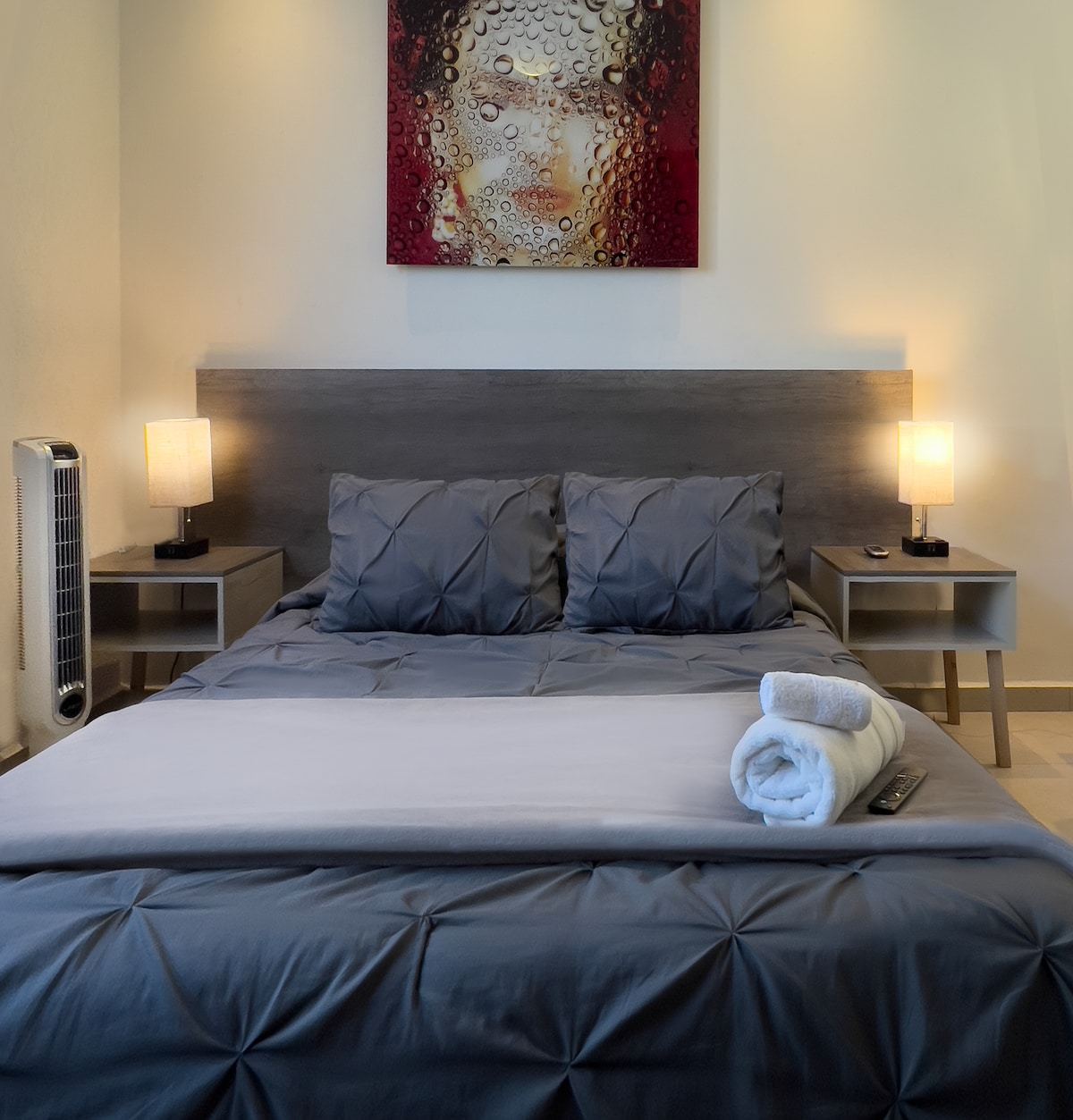 La suite esta equipada para brindar el mayor confort. Descanse en su cama con colchón memory foam mientras ve una película en la smart TV, WIFI alta velocidad. Disfrute de un buen baño en una regadera con acabados de alta calidad. Trabaje sin preocupaciones en el escritorio contamos con wifi de alta velocidad. Prepare comidas en la cocina totalmente equipada, en esta suite tendrá todo lo necesario para una estancia corta o larga.