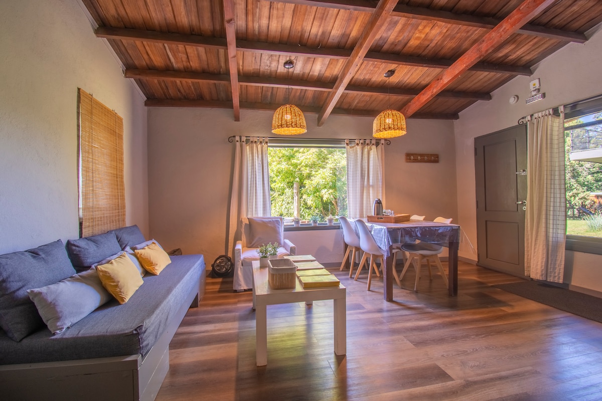 Cálida cabaña de estilo rústico a orillas del lago Nahuel Huapi con hidromasaje, hogar a leña, y deck. Monoambiente creado para el relax y el romanticismo con vista al amanecer y salida de la luna sobre el lago. Smart TV e internet por FIBRA OPTICA con wifi para trabajar. Una kitchinette con todo lo necesario, incluyendo cafetera dolce gusto. Caja de seguridad para resguardar tus notebooks al ir de paseo. Baño completo. Pool, ping-pong. Playa: Kayak y standup paddle. Desayuno continental.