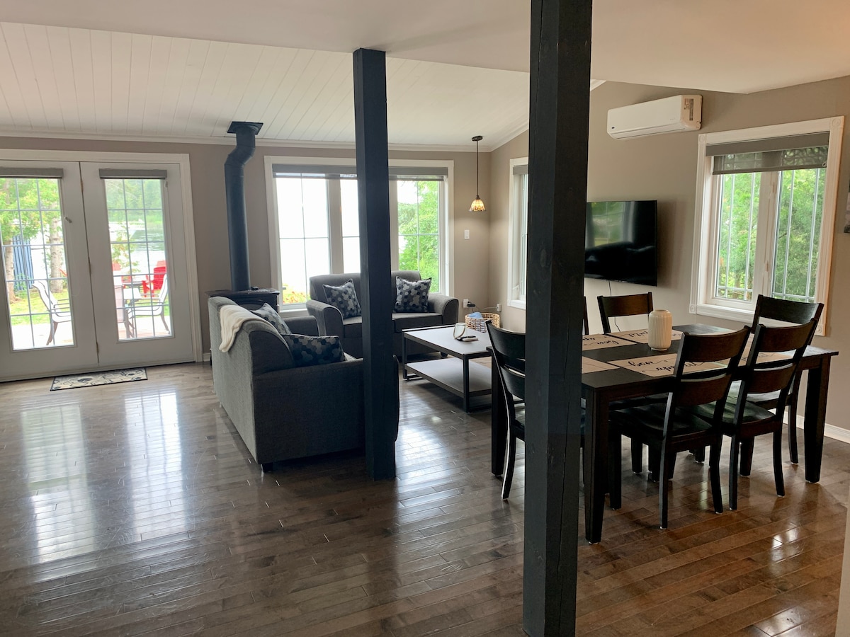 ¡Disfruta de vistas panorámicas del lago Lower Buckhorn con la familia! Relájate en el jacuzzi sobre las rocas del Escudo Canadiense, enclavado entre los altos pinos. Esta cabaña frente al mar recientemente actualizada cuenta con 3 dormitorios y un concepto de espacio de estar abierto. ¡Más de 280 pies de frente al mar para que disfrutes del amanecer y el atardecer y pesques en el muelle! Ponte en contacto con nosotros en el sofá, juega o mira las películas. Date un paseo por toda la isla. Wifi de alta velocidad para trabajar o jugar. A 6 minutos de la ciudad, a menos de 2 horas de GTA.