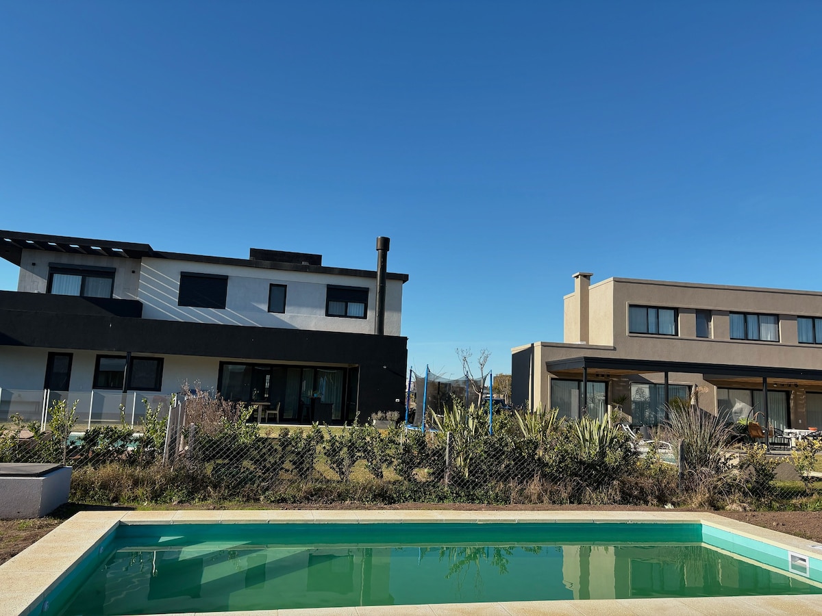 Casa en barrio privado inaugurada en marzo de 2022, diseño único mid-century modern. Amplia, funcional y acogedora. Aire frío/calor en todos los ambientes. Calefacción por losa radiante. Gran parrilla, anafe y horno eléctricos, artefactos de 1ra, aberturas doble vidrio y galería con los mejores atardeceres por su orientación Noroeste. Jardin con salida a amplia laguna. Cama California king en suite. Colchones de 1ra. Wifi alta velocidad. ::No se permiten eventos, mascotas o invitados extra