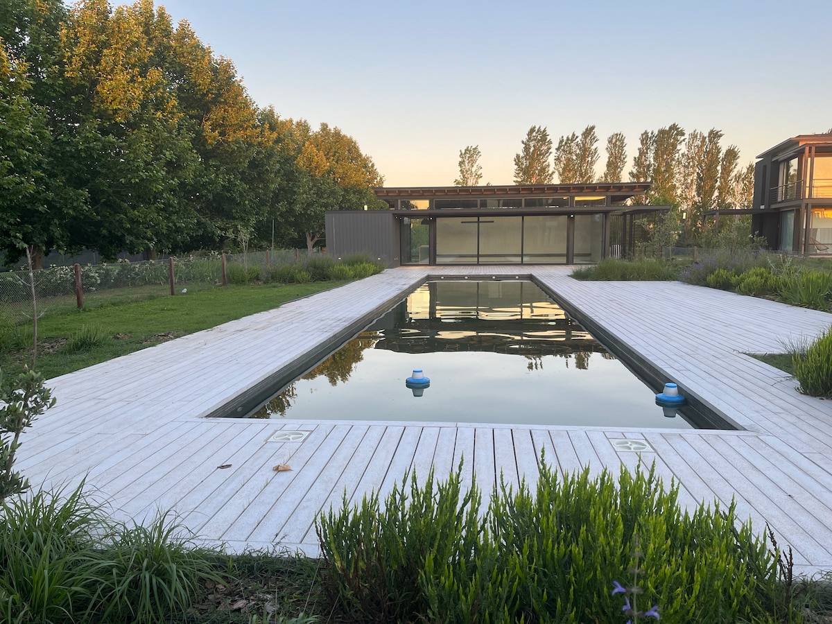 Casa en barrio privado inaugurada en marzo de 2022, diseño único mid-century modern. Amplia, funcional y acogedora. Aire frío/calor en todos los ambientes. Calefacción por losa radiante. Gran parrilla, anafe y horno eléctricos, artefactos de 1ra, aberturas doble vidrio y galería con los mejores atardeceres por su orientación Noroeste. Jardin con salida a amplia laguna. Cama California king en suite. Colchones de 1ra. Wifi alta velocidad. ::No se permiten eventos, mascotas o invitados extra