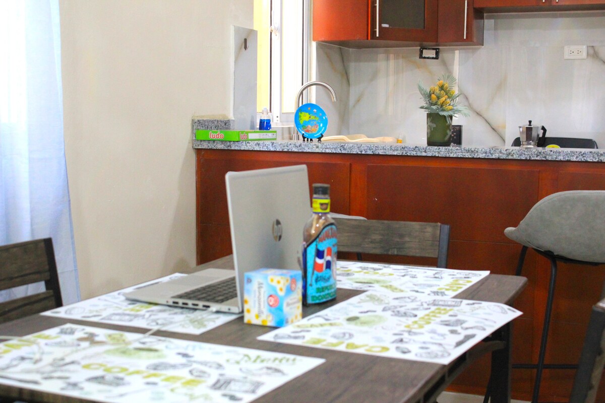 Perfecto para vacaciones, trabajo o viajes de negocios. Apto. moderno y elegante, ubicado en una excelente zona de San Francisco de Macorís, cerca de Parque Doral, Las Cejas, a solo 5 min. de rest., mall, bares, gym, discotecas y tiendas. En segundo piso, cuenta con 3 hab.,Aires, principal con walk-in closet y baño, baño común, sala, comedor, cocina equipada, balcón, lavadora secadora en una sola máquina, parqueo dentro, Wi-Fi, agua caliente y seguridad. Ideal para todos, seguro y tranquilo.