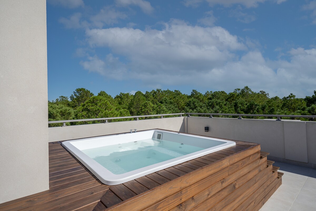 Hermoso alojamiento en Renata Norte, Pinamar. Ideal para parejas o familias con niños. Vistas impresionantes. Terraza privada de +80 m² con parrilla y jacuzzi. Amenities de lujo: piscina interior y exterior, gimnasio, spa con sauna y microcine. Seguridad 24 hs. Cochera para camioneta o auto. A 200 m de la playa y cerca de zona comercial Pinamar Norte. Rodeado de bosques, inmerso en la naturaleza y cerca del centro histórico de Pinamar.