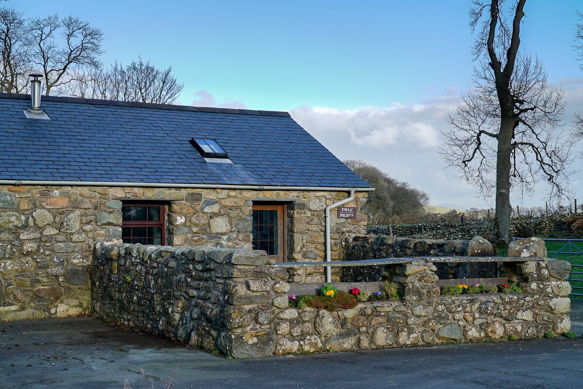 Cute Cottage on a working farm in Pen Llyn, North Wales with a private hot tub overlooking our farm and forest. Between the Mountains and the Sea, you are close enough to everything but far enough for a peaceful get away. Enjoy walks down to our private ancient woodland and along the country lanes.