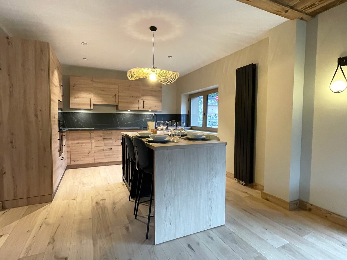 Le chalet est proche de la ville, situé à 1km de la gare, funiculaire. Appart de 125 m2 sur 2 niveaux, 4 chambres, une salle de bains, 2 WC. Il est parfait pour les couples et familles avec enfants. Tout équipé, décoré style chalet montagne, vieux bois, logement neuf. Une place de parking devant le chalet, local à vélos/skis Frais de ménage : mise à disposition et entretien du linge de lit et serviettes de toilette, ménage de fin de séjour. Quartier résidentiel, calme. Vue sur les montagnes .