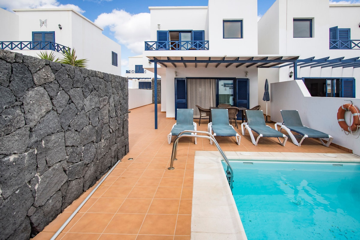 La villa se encuentran en Playa Blanca, Lanzarote, en la zona de las Coloradas. Cuenta con una sala comedor con cocina americana equipada con todo lo necesario para cocinar cómodamente, dos dormitorios (ambos equipados con dos camas individuales), también dispone baño, solana, amplia terraza y piscina privada. La villa esta decorada con buen gusto, sencilla, intimista y con elementos naturales. Dispone de TV ( canal satélite) y acceso a Internet wifi.