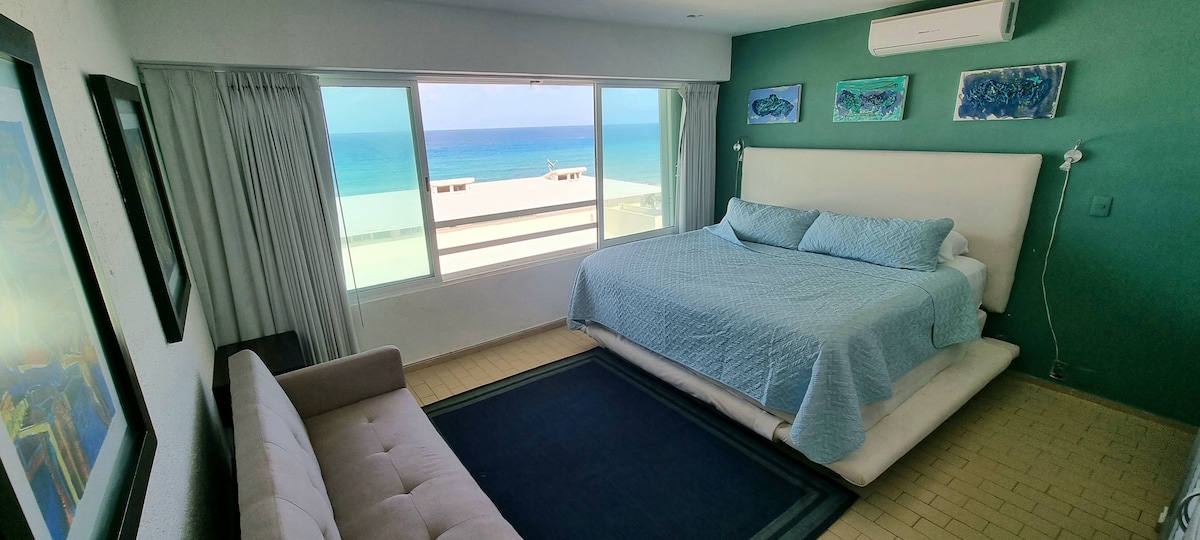 Hermoso y Amplio condo frente al mar perfecto para una pareja, cuenta con una cómoda cama KS, TV plana de 45", escritorio cajonera, comedor, cocineta equipada, WiFi, dispensador de agua purificada. Incluimos servicio de limpieza cada tercer día con cambio de toallas. Viaja ligero, aquí te proveemos gratuitamente toallas de Playa!