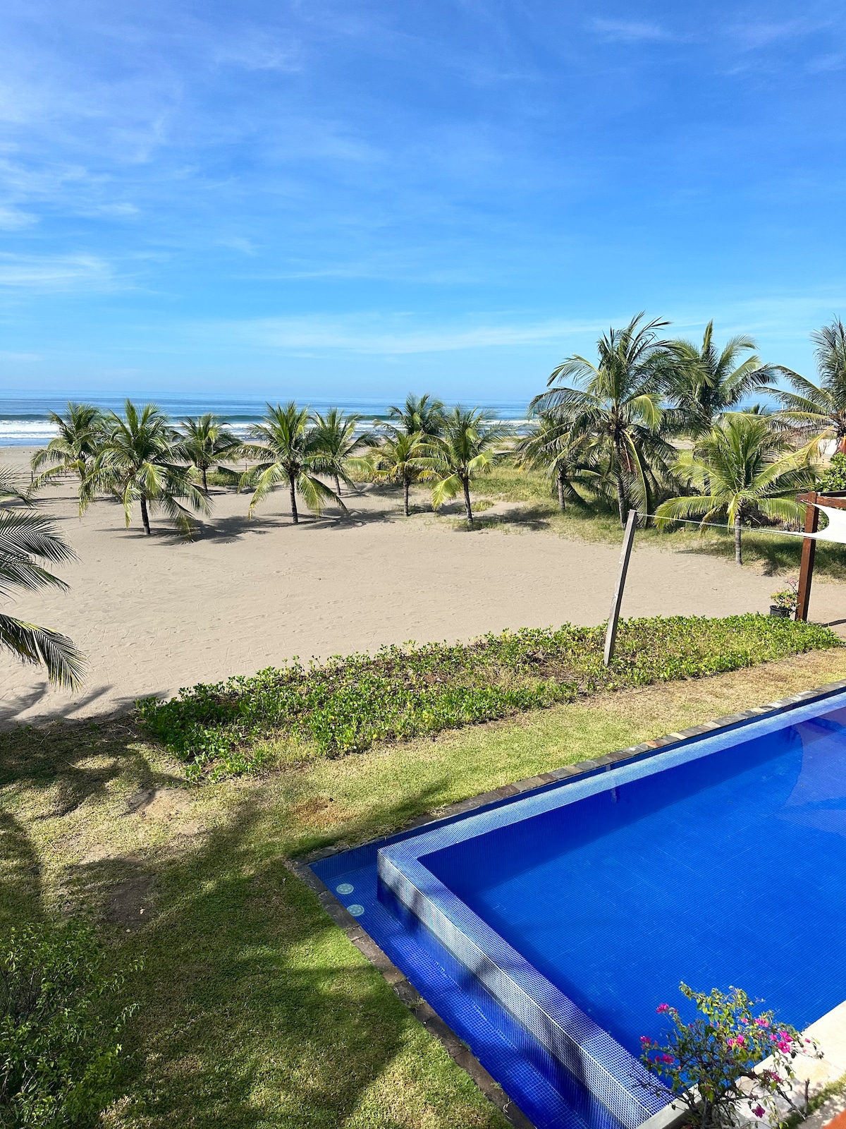 Recién construida, espectacular casa de playa frente al mar. Esta propiedad cuenta con casa principal con tres dormitorios con baño propio y aire acondicionado en cada habitación. El rancho social cuenta con baño, comedor principal, desayunador, y bar. Todo esto a unos pasos de una refrescante piscina de filtro. Los jardines son engramados y su verde espectacular contrasta con el azul del mar. La cocina esta completamente equipada con refrigerador, freezer, cocina y todos los utensilios.