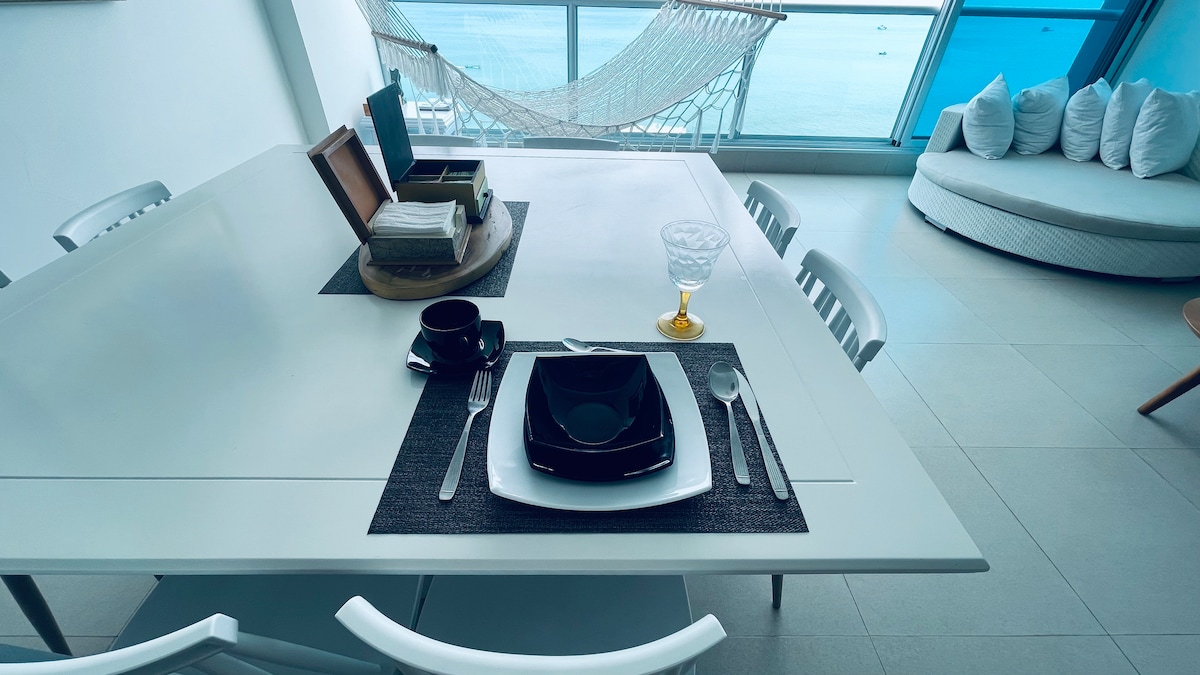 Apartamento ubicado en el Hotel Colon de Salinas. - Cuarto con Smart TV de 75 pulgadas y Netflix - 2 baños con ducha - Balcón con vista directa al mar - Sala - Cocina - Café y cafetera - Parqueo privado - Seguridad 24 horas - 3 piscinas - Justo al comienzo de El Malecón - Servicio de hotel (Restaurante, spa, gimnasio, room service). Estos servicios son independientes del apartamento. *Solo se permiten 2 huéspedes por noche* *Por favor tener cuidado con la hamaca*