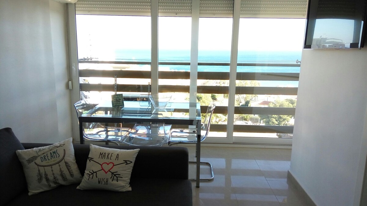 Apartamento con increíbles vistas panorámicas del Mediterráneo, ideal para parejas con o sin hijos. Primera línea de playa con gran terraza orientada al sur-este donde disfrutar de bellos amaneceres. Reformado recientemente y equipado con climatización y wifi. Situado en complejo residencial con piscinas y parque acuático, además de servicios opcionales de spa y gimnasio entre otros. Cercano a puerto deportivo y junto a gran parque urbano con zonas infantiles.