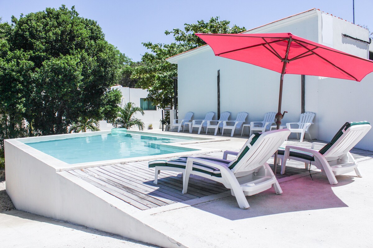 ¡Casa Frida Cozumel es un hermoso bed and breakfast! Puedes alquilarla, privada, toda para ti. Nuestra encantadora villa está amueblada con una bonita decoración, muy espaciosa con 5 dormitorios y 5 baños, bonito comedor y sala de estar, gran jardín con piscina, comedor exterior con ventilador, zona de hamacas, tumbonas. Incluye un delicioso desayuno. Casa Frida tiene el entorno ideal para que familias y amigos disfruten de tiempo de calidad juntos. Servicio de limpieza diario incluido (excepto domingo).