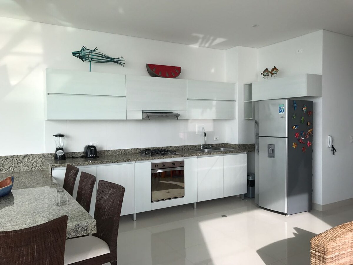 Es un apartamento con excelente vista al mar, ambiente familiar El edificio cuenta con piscina y jacuzzi Es un edificio residencial con servicio de portería y vigilancia durante las 24 horas. Cuenta con un ascensor y parqueadero. A 2 kms del edificio encontrara supermercados como El Oriente, Olímpica, D1 y Ara. El costo incluye una persona que presta apoyo de aseo, y cocina con un horario de 8am a 4pm. Capacidad máxima de Huéspedes 8 personas ( incluyendo niños)