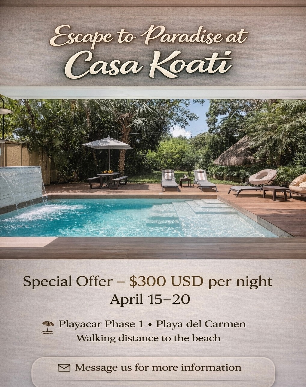 Esta situado en la zona más valorada y segura, El Fraccionamiento Playacar fase 1. Caminando entre agradables y bellos jardines tropicales a pocos minutos la famosa 5th Avenida y de las más azules aguas del mar Caribe. Impecable Piscina exclusiva para nuestros huéspedes, cuenta con seguridad privada las 24 horas del día, además de tener fácil acceso a pie a la principal área comercial, turística y a la más hermosa playa del Caribe. No cargos adicionales por electricidad.
