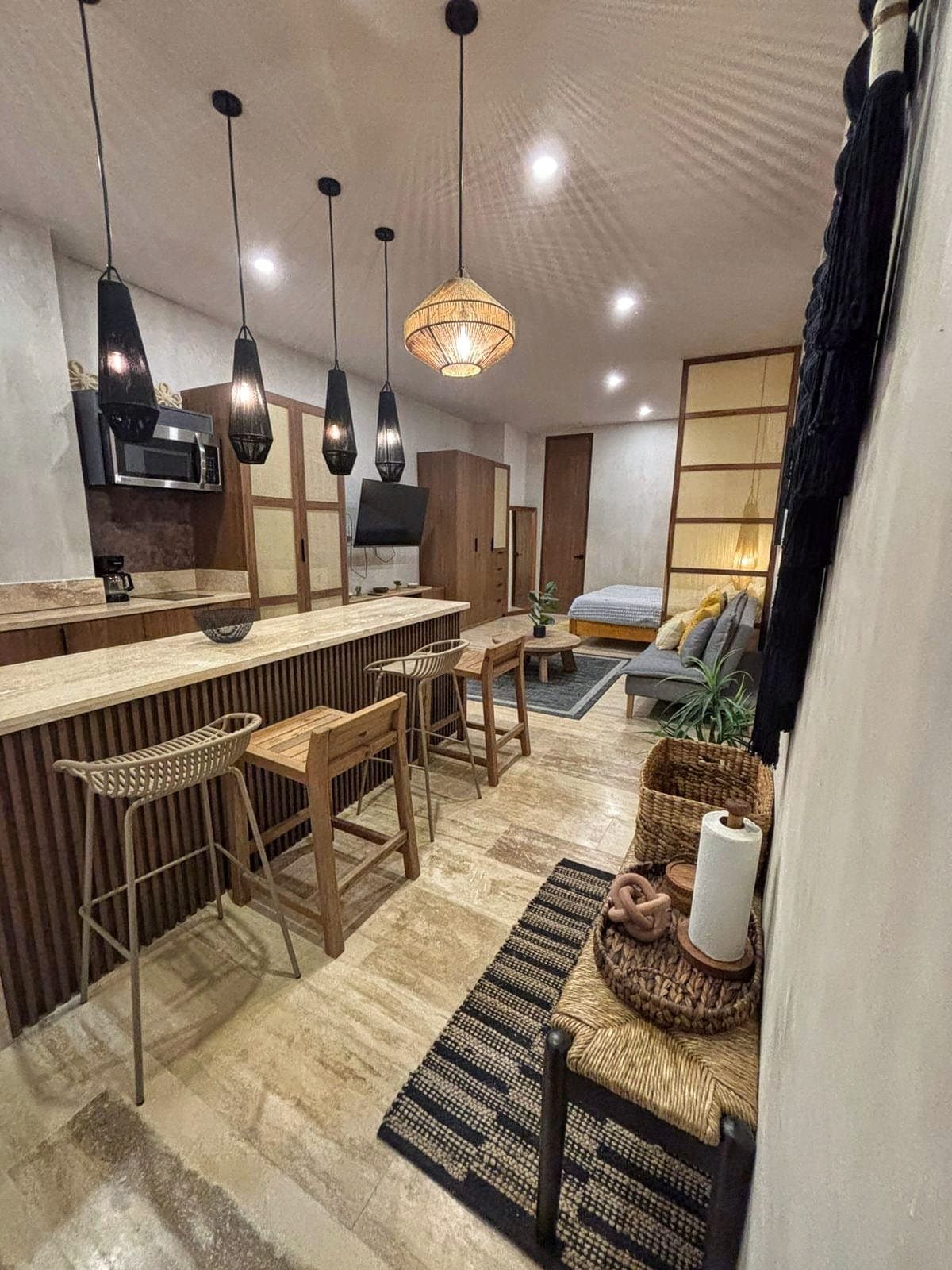 Cómodo departamento para 4 personas con internet de alta velocidad (hasta 200MB) ideal para Home office. En un edificio diseñado específicamente para turismo. Gym equipado, roof con alberca, elevador, áreas verdes, Lobby y área de coworking con internet. Seguridad privada 24 horas, cámaras de seguridad y acceso controlado. Disfruta de Playa del Carmen en una de las zonas más tranquilas de la ciudad. Frente al parque cultural "La Ceiba" y a tan solo 8 minutos de la playa. Un lugar tranquilo!