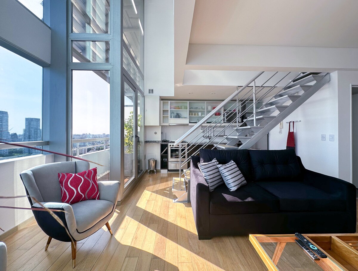 Este apartamento de dos niveles en el piso 25 en Palermo Soho es maravillosamente espacioso y está inundado de luz solar durante el día, gracias a sus ventanales del suelo al techo con vistas a la ciudad. Edificio con seguridad las 24 horas, piscina abierta del 15 de noviembre al 15 de abril. Entrada: 14:00 y salida: 11:00. La llegada entre las 20:00 y la medianoche tiene un cargo por llegada tardía de 20 USD. Reservando desde el día anterior, se permite hacer el registro de entrada a las 8:00 h. NO es posible realizar el registro de entrada entre la medianoche y las 8:00 a. m. La cama del apartamento mide 180 cm por 190 cm.