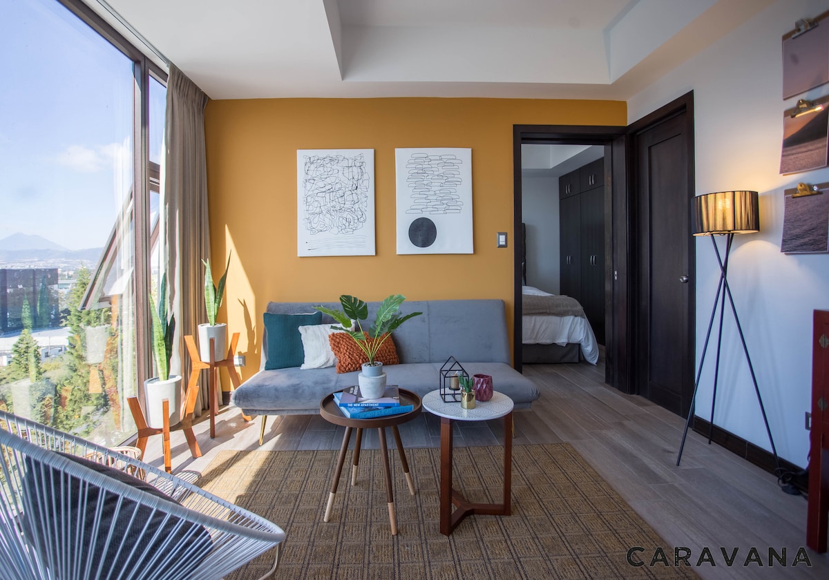 Disfruta de vistas espectaculares e inigualables a los volcanes desde el balcón en este moderno estudio. El apartamento esta esta 100% equipado con amenidades de alta calidad. Desde una cama queen y un sofá cama, hasta una cocina totalmente equipada y cortinas blackout. Incluye un espacio de estacionamiento, acceso al gimnasio y a la tienda de conveniencia del edificio. A solo 8 minutos del aeropuerto, es el lugar perfecto para ti