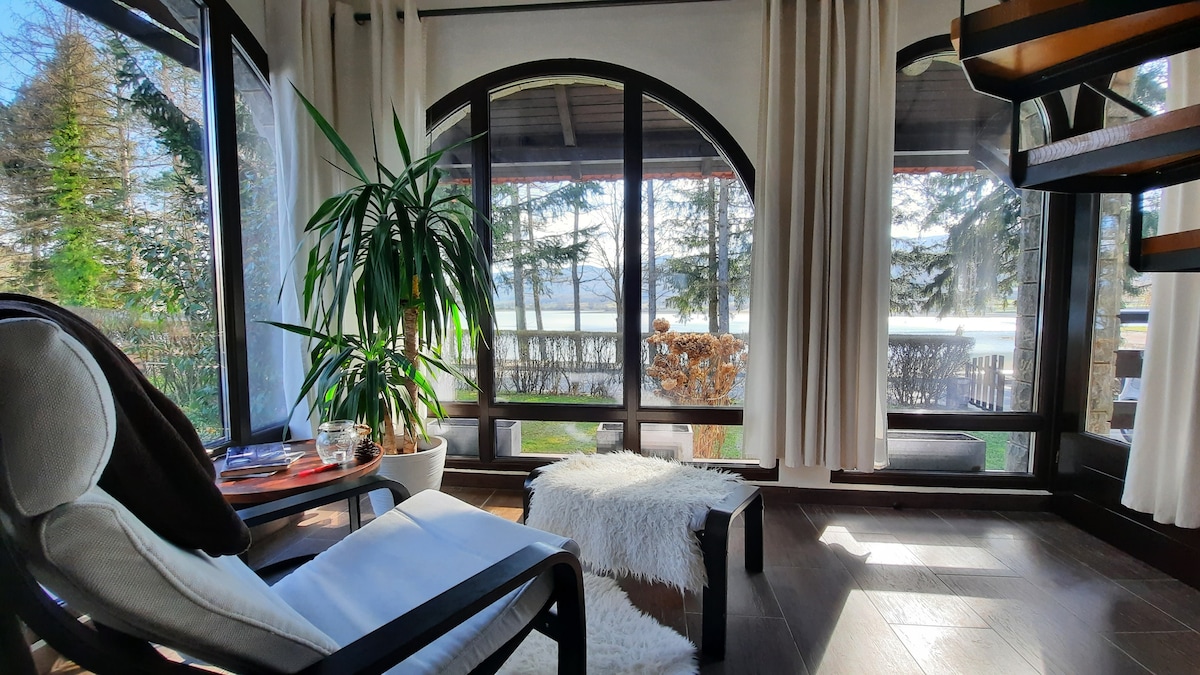 Apartman se nalazi se uz obalu jezera iz kojeg se kroz velike ostakljene stijene pruža pogled na samo jezero i okolna gorja. Idealan je za opuštanje i bijeg od gradske vreve. Parovi mogu uživati u intimnosti smještaja, a zbog kapaciteta od 5 odraslih osoba moguća su i ugodna obiteljska okupljanja. Ljeti se može kupati u jezeru i uživati na vanjskoj terasi, dok zima nudi smještaj u toplini unutarnjeg kamina. Grijanje je automatizirano na pelet, dok si za dodatan ugođaj možete korisiti kamin.