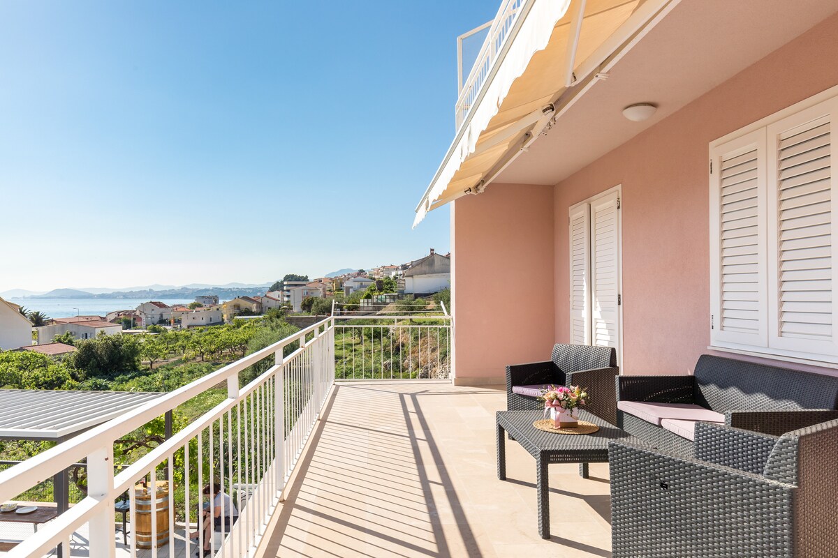 Terraza privada en la azotea con jacuzzi y vistas impresionantes al mar Adriático. Acogedor departamento en el último piso, ideal para parejas que buscan una estadía tranquila y relajante cerca de Split. Disfrute de las puestas de sol, de una privacidad total y de una ubicación tranquila a solo 15 minutos de la ciudad. Playa, restaurantes y tiendas a pocos pasos.